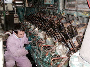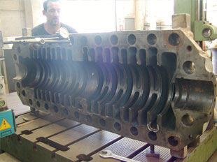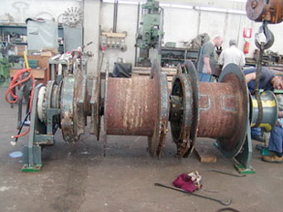 | 7. Rettifica di alberi motori diesel e relativo bed-plate (In posto) per motori fino a 12 cilindri a "V" 5000 Hp. | 8. Sostituzione su motrice principale Diesel di bancale, monoblocco e alberi fino a potenze di 5000 Hp. | 9. Revisione generale di verricello salpancore eseguita in officina. |