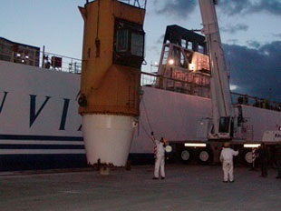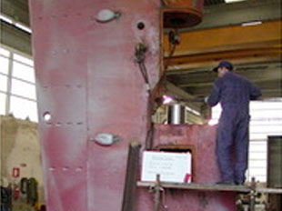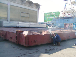 | 19. Sbarco, riparazione e reimbarco di portelloni fino a 25 Ton di peso, mediante raddrizzatura, rinnovo parti e rifacimento delle guarniture. | 20. Imbarco e sbarco macchine ed apparecchi con autogrù e pontone fino a 100 ton. | 21. Rinnovo condotte in acciaio inox di navi chimichiere e riparazione. |